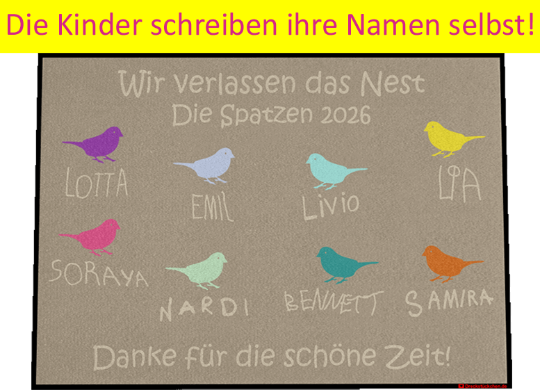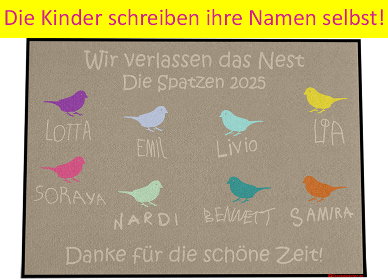 Preisspanne: 44,90 € bis 750,00 € zzgl. Versand, inkl. 19% MwSt.Die Kindergarten Kita Vorschulkinder Abschiedsfußmatte Spatzen (Entwurf S)25/04/2020 -